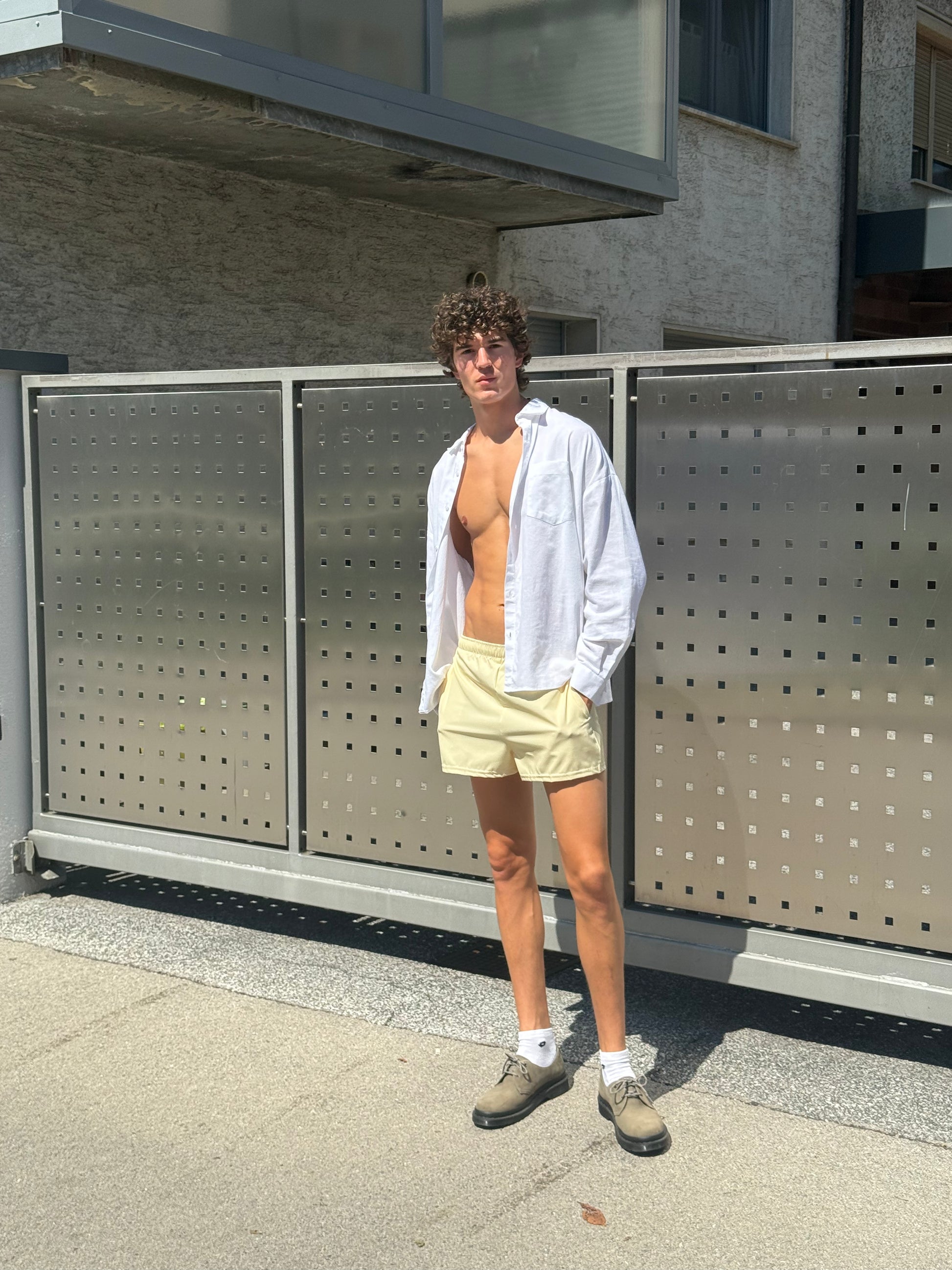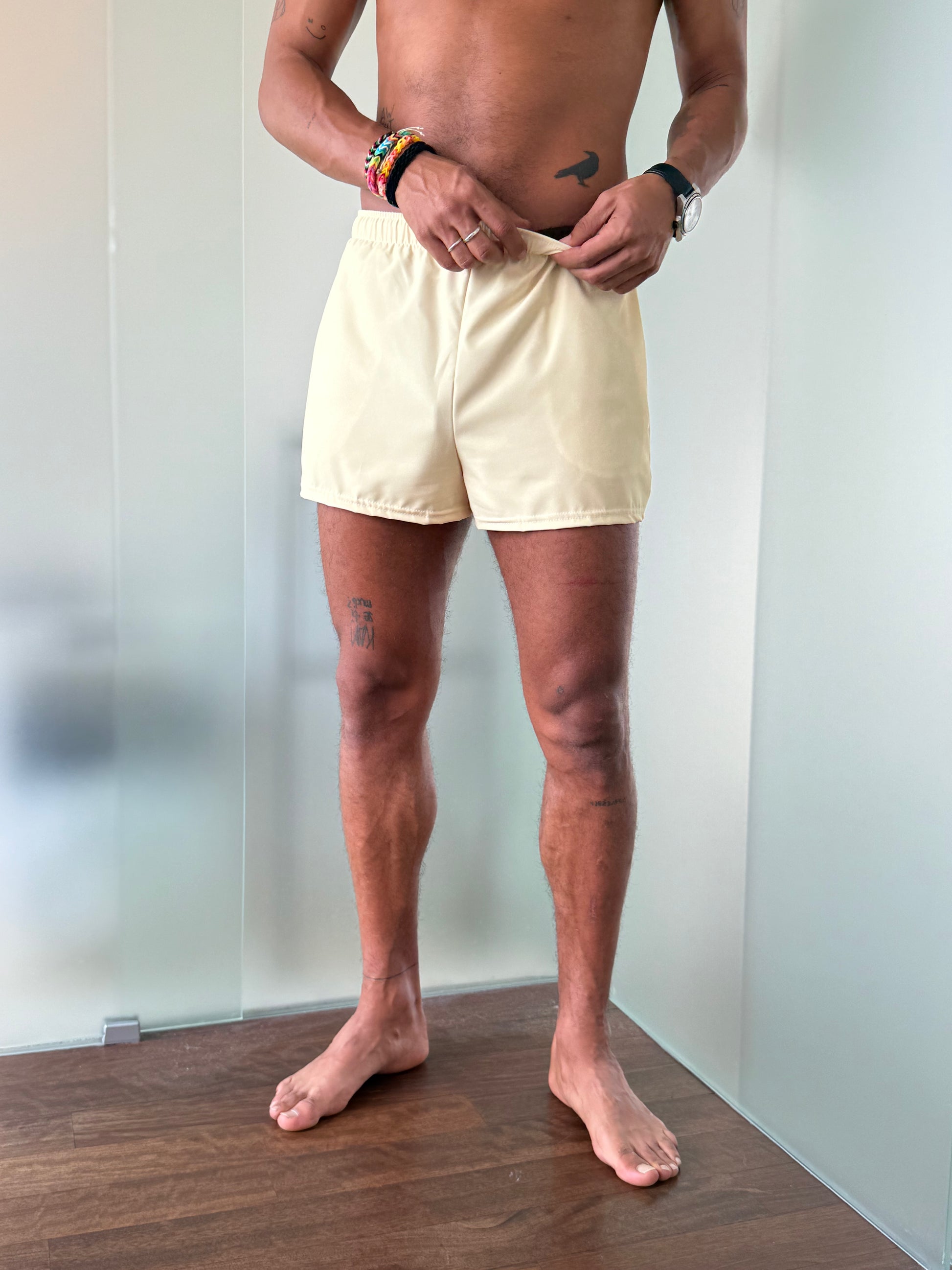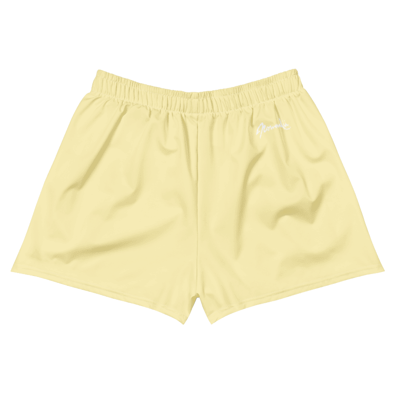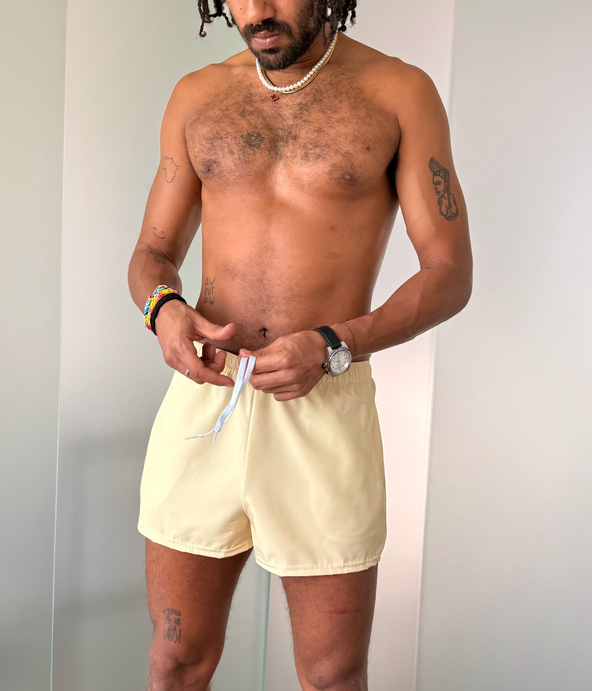 Svetlo rumene kratke hlače združujejo funkcionalnost športne opreme in sodobno urbano estetiko. Izdelane so iz tehničnega materiala z 9% elastana in recikliranim poliestrom.