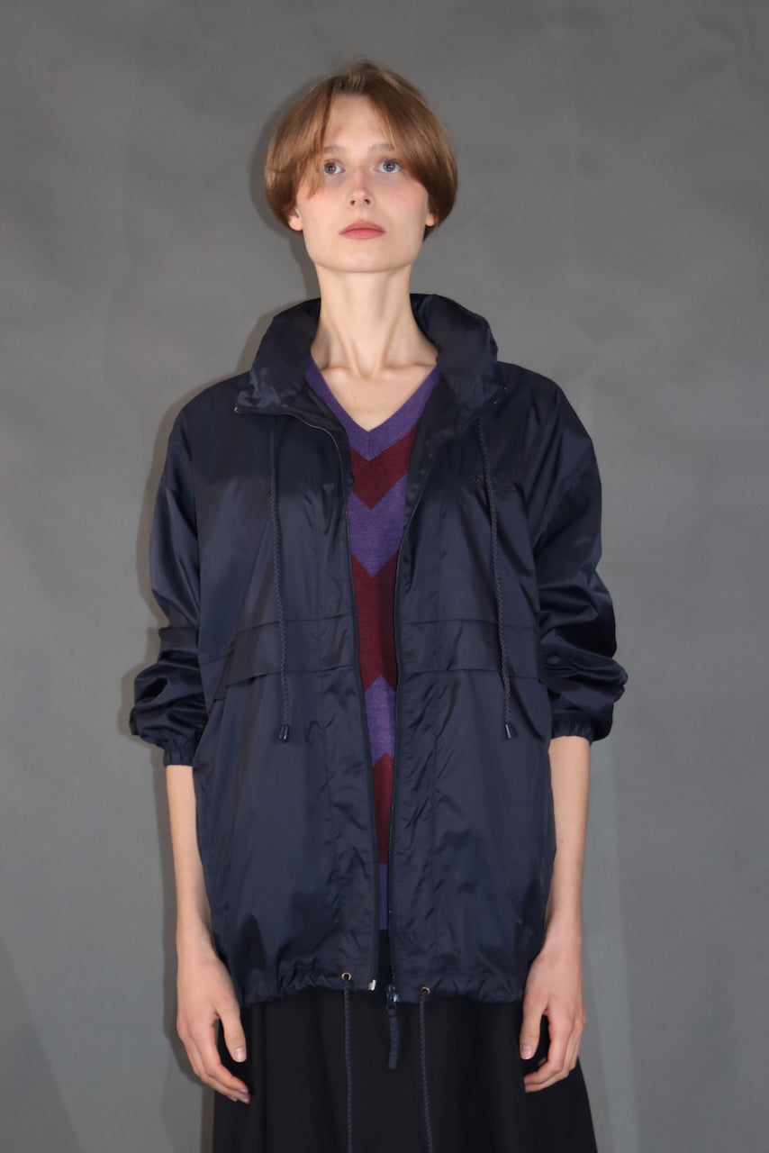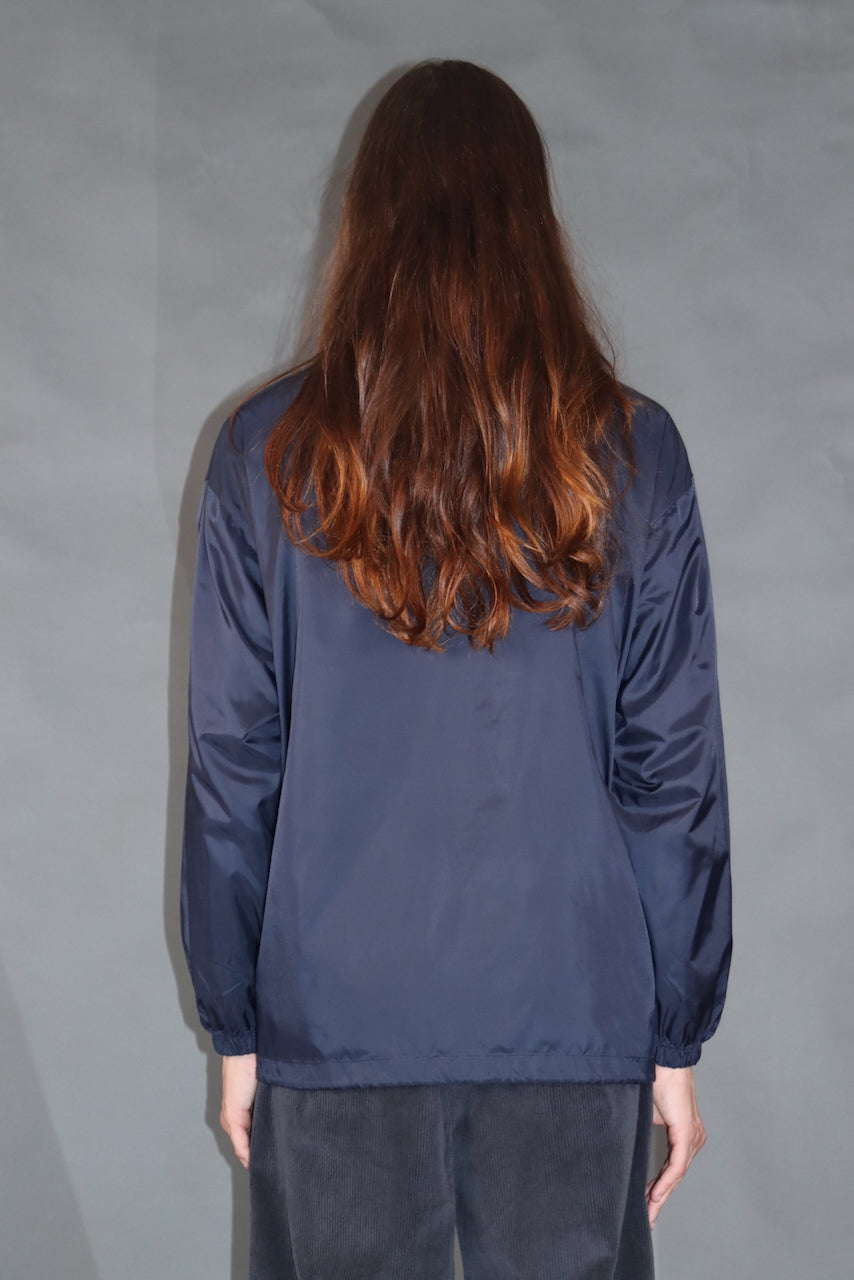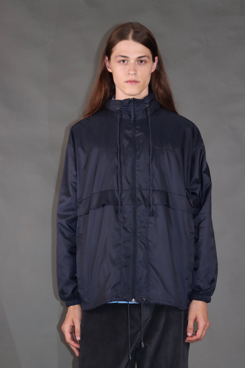 Lahka vetrovka iz recikliranega poliestra v temno modri barvi — popolna za vsakodnevno nošenje, prosti čas ali sprehode v naravi. Ščiti pred vetrom in rahlim dežjem. Zložljiva kapuca, skrita v ovratniku, in zadrge v stranskih žepih zagotavljajo udobje in praktičnost.