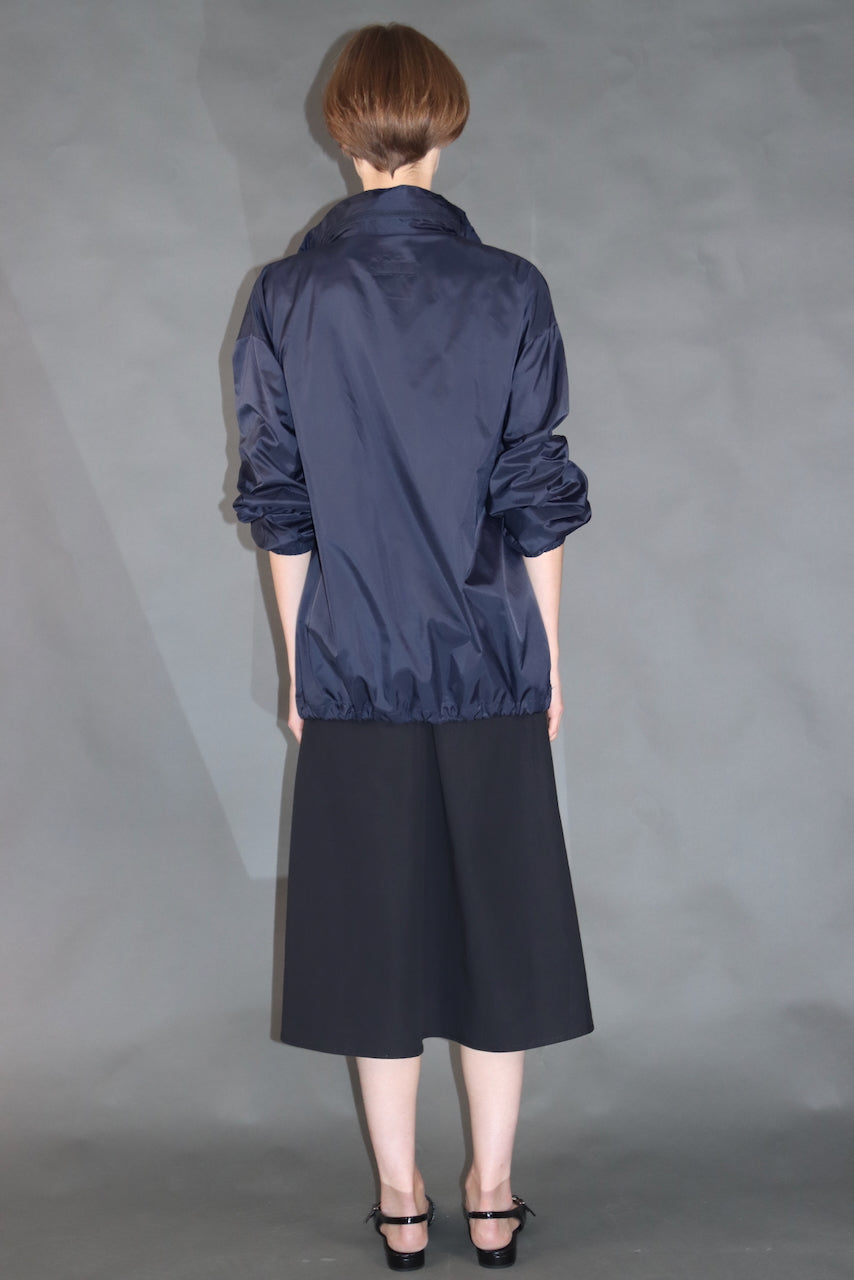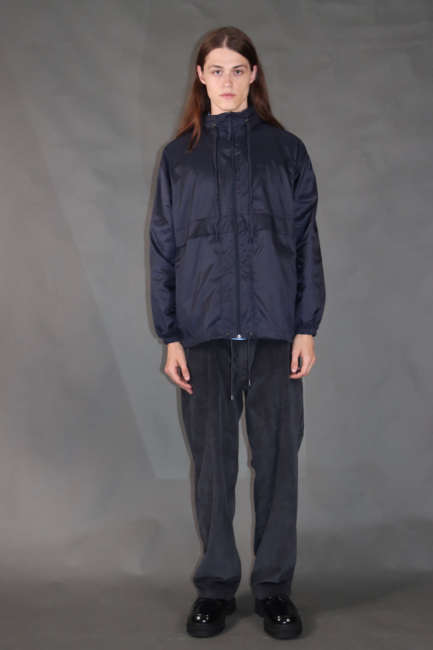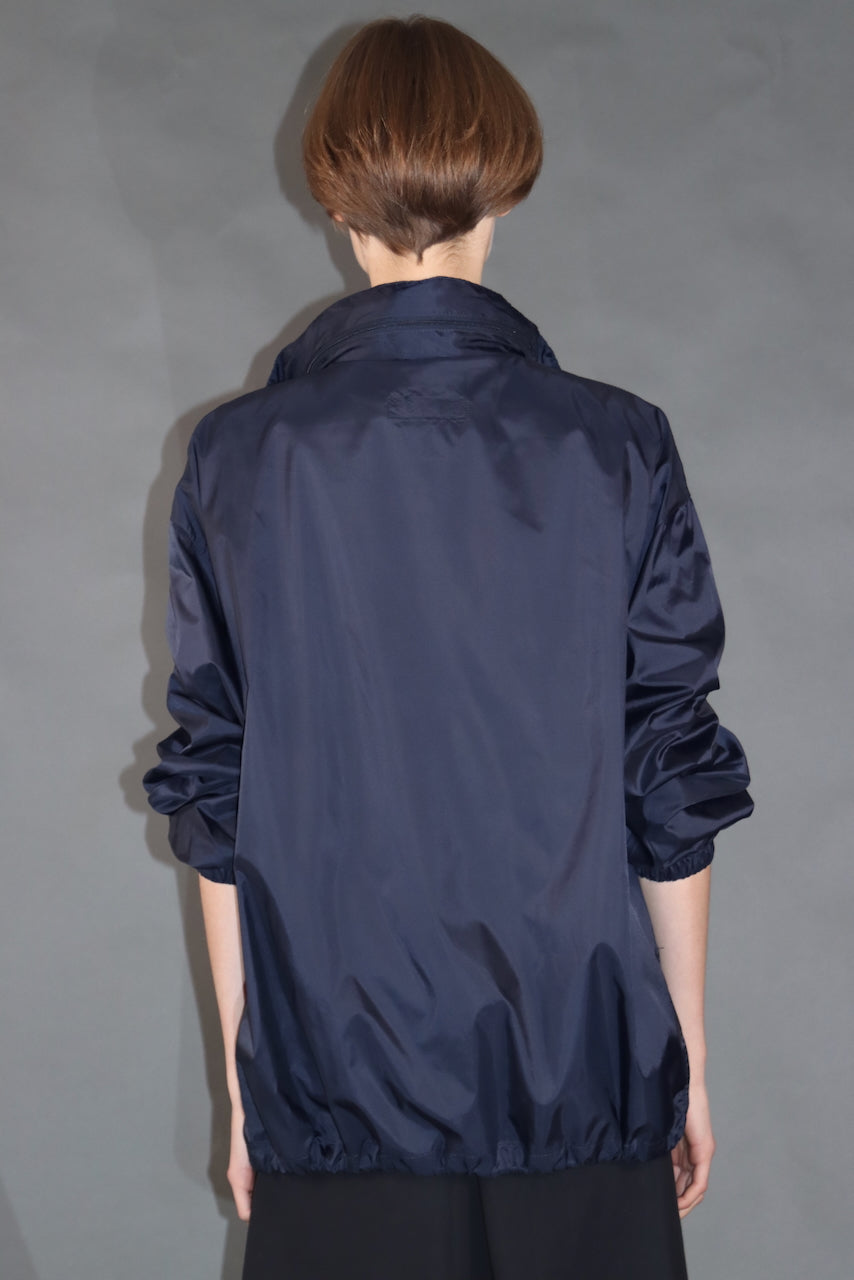 Lahka vetrovka iz recikliranega poliestra v temno modri barvi — popolna za vsakodnevno nošenje, prosti čas ali sprehode v naravi. Ščiti pred vetrom in rahlim dežjem. Zložljiva kapuca, skrita v ovratniku, in zadrge v stranskih žepih zagotavljajo udobje in praktičnost.